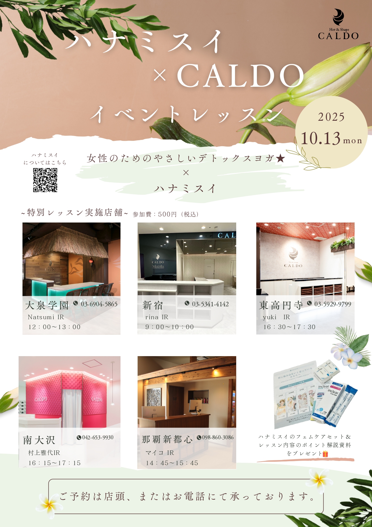 本イベントは、カルドとハナミスイが初めてコラボレーションして開催するイベントで、女性のためのやさしいデトックスヨガを体験できます。ハナミスイは過去にもヨガイベントに協賛をし、ヨガを受講される生徒さんとフェミニンケアの親和性は高いと感じていました。その経験から、今回ホットヨガのカルドでもフェムケアの大切さを知っていただける機会をいただくこととなりました。